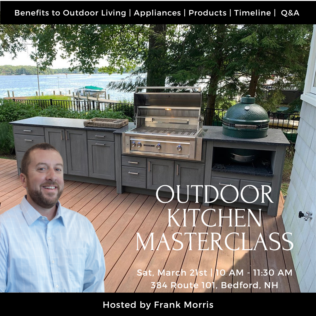 Join us on March 21th for Granite State Cabinetry’s Outdoor Kitchen MasterClass and learn exactly how to plan an outdoor space you’ll love using all season long. We’ll walk you through the must-know decisions—layout and flow, materials that hold up in New England weather, appliance and grill options, smart storage and lighting, and the finishing touches that turn a “grill area” into a true backyard destination. You’ll leave with practical ideas, insider tips from our design team, and clear next steps to bring your dream outdoor kitchen to life—just in time to be ready for spring entertaining.